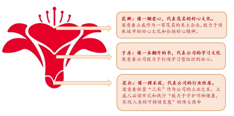 授之為企花代表,取其色,象征著紅紅火火的活力感,取其意,象征著蓬勃向上的生機(jī)感。寓意立威人積極向上,努力拼搏的精神;憑借堅(jiān)韌不拔的品質(zhì),以熱情的態(tài)度致力于守護(hù)作物健康,持續(xù)為農(nóng)業(yè)發(fā)展做貢獻(xiàn)。