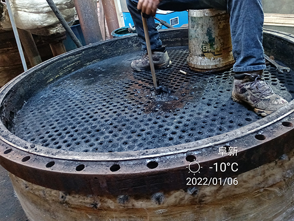 2022年1月24日星期一,虎年(農(nóng)歷臘月二十二)大寒季節(jié),室外時(shí)溫零下—16℃,遼寧省彰武縣興隆山鄉(xiāng)老虎坨子村,阜新市彰武縣達(dá)凱化工有限公司糠醛廠,在高經(jīng)理的精心安排下,蘇振山廠長(zhǎng)給我們指導(dǎo),積極與我們河南都市機(jī)械設(shè)備有限公司喬俊陽(yáng)技術(shù)員配合,改制了一款寬槽橡膠滑輪,對(duì)結(jié)垢堅(jiān)硬,徹底燒干堵死的廢水蒸發(fā)器管子進(jìn)行疏通,清理,經(jīng)過(guò)實(shí)驗(yàn),既節(jié)省了人力,又安全,又快捷,確實(shí)是值得分享的好辦法!