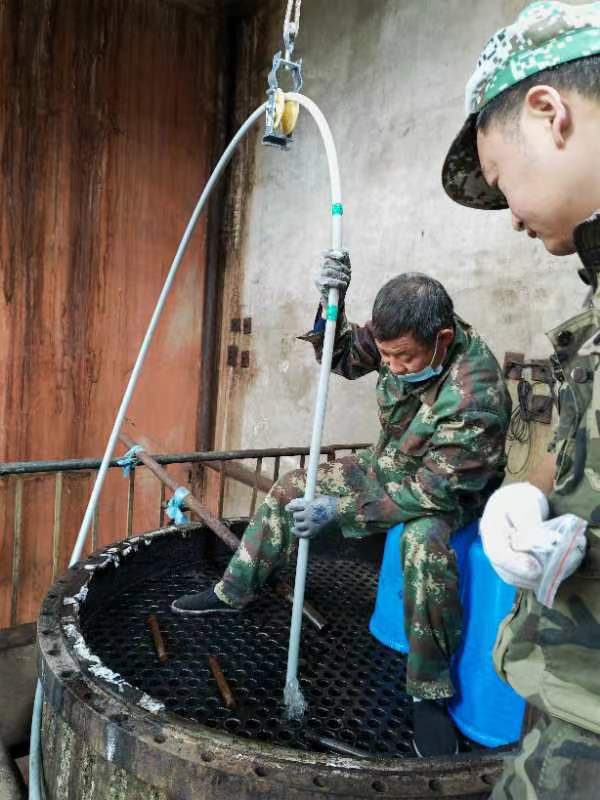 2022年5月28日黑龍江省哈爾濱市呼蘭區(qū)康金鎮(zhèn)小趙村哈爾濱市盛大化工有限公司在費總的精心安排下,孫總親自坐鎮(zhèn)指導,生產(chǎn)廠長潘峰與河南都市機械設備有限公司喬主任,都紅植技師密切配合,徹底了解GQ-600型智能清洗機的性能和特點,使用600型智能清洗機四個要點1,不能缺水,要使用干凈的靜水,2,過載保護扭力限制器要調(diào)到,軟軸跳動可以自動停下來,不然既不安全,又失去他的意義,3,軟軸要放平拉直,順勁擺放,不能打死彎,盡可能防止扭軸斷軸,4,鉆頭要大小適當,太大了容易卡軸扭軸斷軸,并且一定要直對疏通管道口。三天時間打通清洗了兩臺徹底堵死好、結垢堅硬的污水蒸發(fā)器,廢水蒸發(fā)器,沒有損壞一根軟軸,沒有損壞一個鉆頭和配件,為糠醛行業(yè)增加了自信,減少了資金損耗,降低成本,提益,做出了標桿!