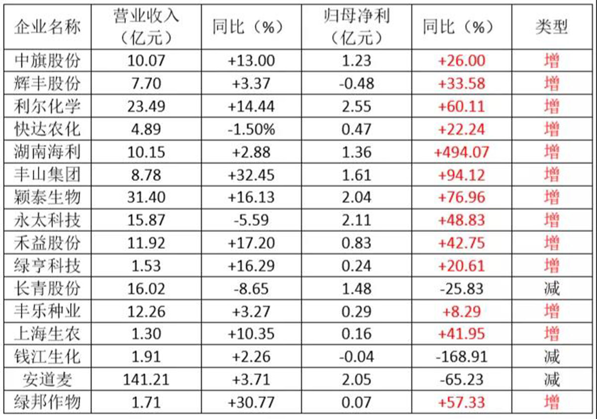 截至9月,滬深兩市農(nóng)藥板塊(包括農(nóng)藥以及農(nóng)藥中間體)32家上市公司半年財報已全部披露,共實(shí)現(xiàn)主營收入784.11億元,凈利潤46.79億元。其中,揚(yáng)農(nóng)化工、雅本化學(xué)、長青股份、利民股份、豐山集團(tuán)等22家公司營業(yè)收入同比增長,中旗股份、穎泰生物、諾普信、海利爾、利爾化學(xué)等20家公司凈利潤同比增長,經(jīng)營業(yè)績穩(wěn)中向好,農(nóng)藥上市公司交出了亮眼的成績單。