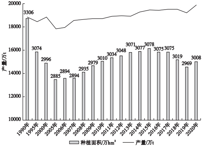 1990—2020年我國水稻種植面積及產(chǎn)量見圖2。