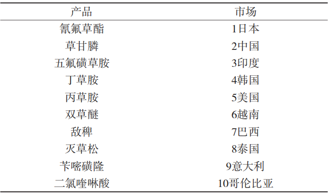 表1 水稻田使用前十的除草劑品種及市場