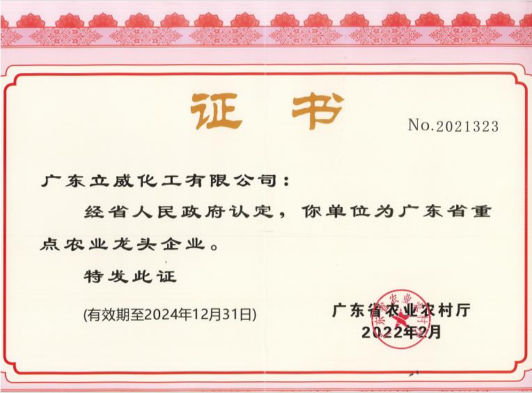 廣東立威化工有限公司榮獲廣東省重點(diǎn)農(nóng)業(yè)龍頭企業(yè)